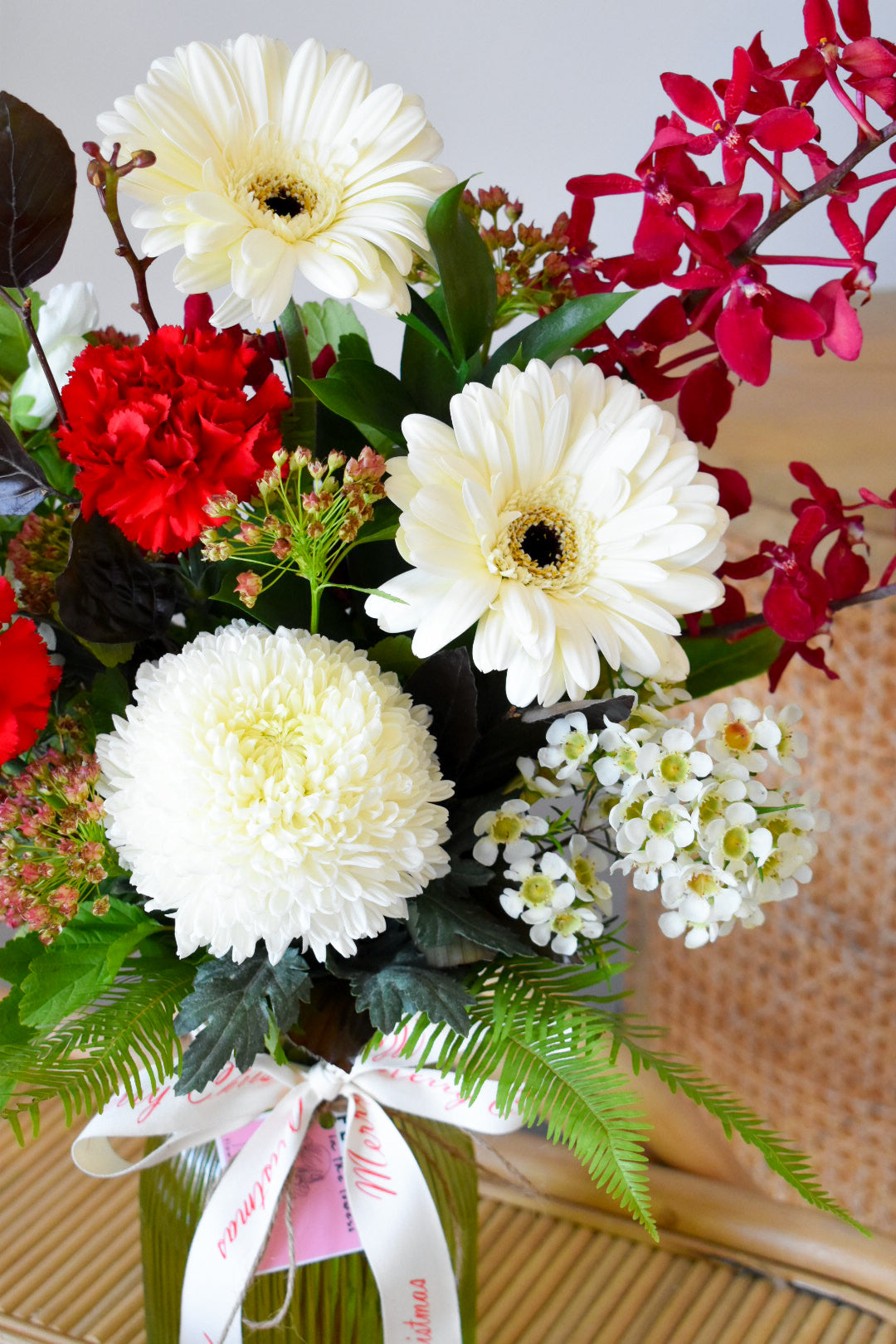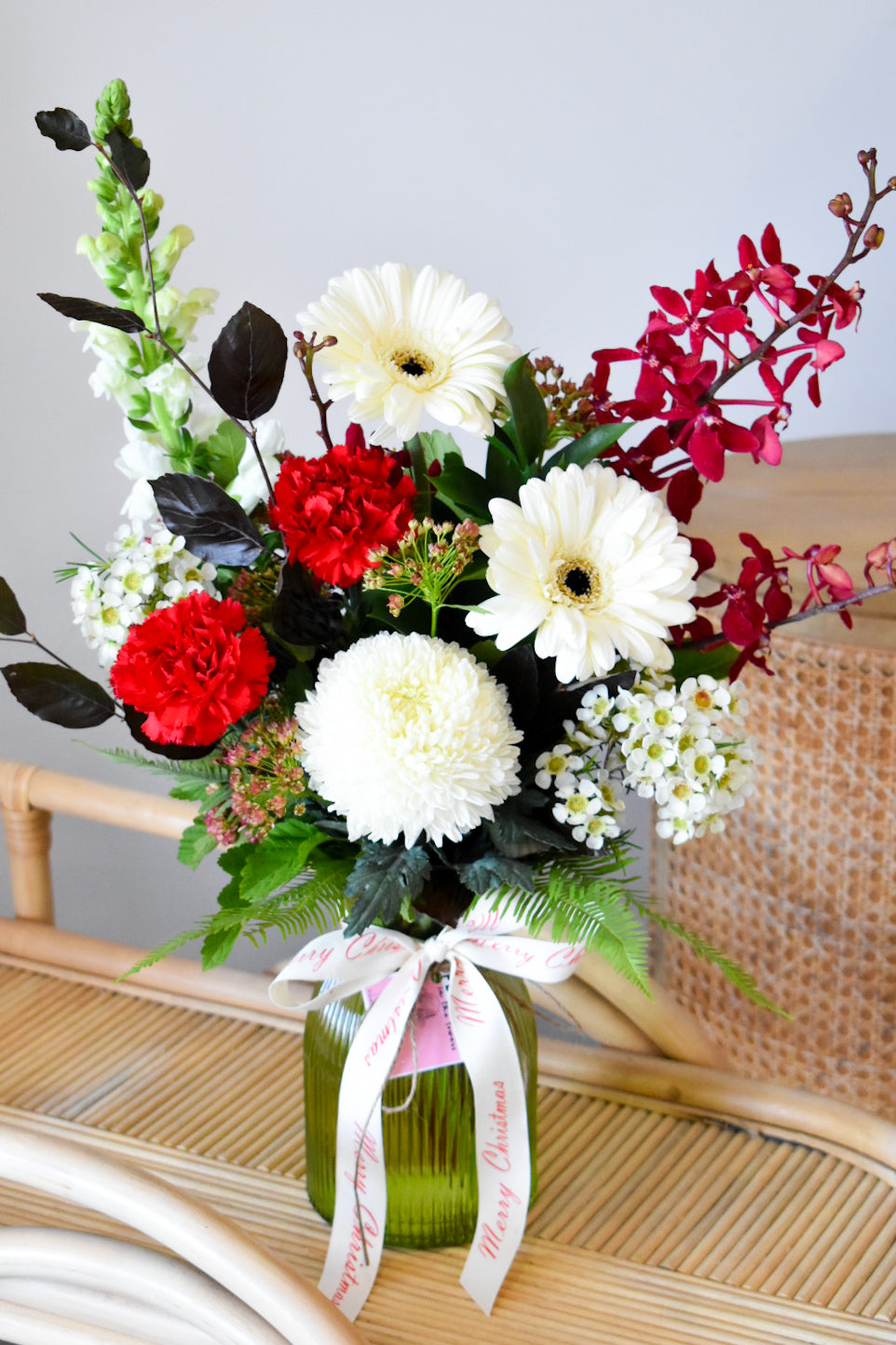 A seasonal mix of Christmas flowers in traditional tones complete in a glass vase.